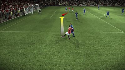 This is not to be confused with the through ball. The through ball is designed to lead a teammate on to goal, threading the ball through the defenders; the ground cross is used to deceptively feed a team member outside the expected target area of your opponent. The ground cross is extremely effective in setting up for a one time strike. It also catches your opposition off guard when you hit the crossing zone and they prepare to see a long high ball, but then have to scramble when the target player is running up from the back for a strike.